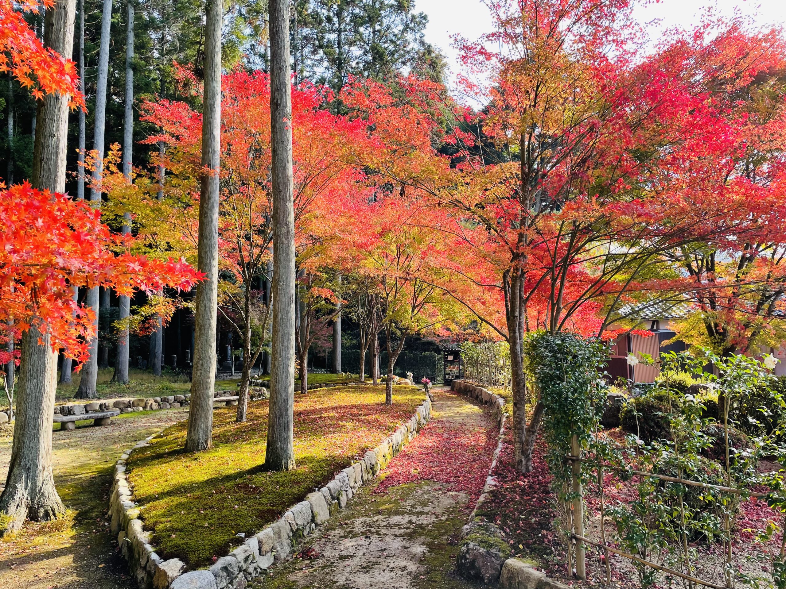 櫟野寺の奥に広がる樹木葬の地「櫟苑」では、紅葉の鮮やかな赤と、杉苔の深い緑が見事に調和し、まるで自然が描いた一幅の絵のような景色が広がっています。立ち止まって深呼吸をすれば、澄んだ空気と静けさに包まれ、心まで洗われるような感覚を覚えます。